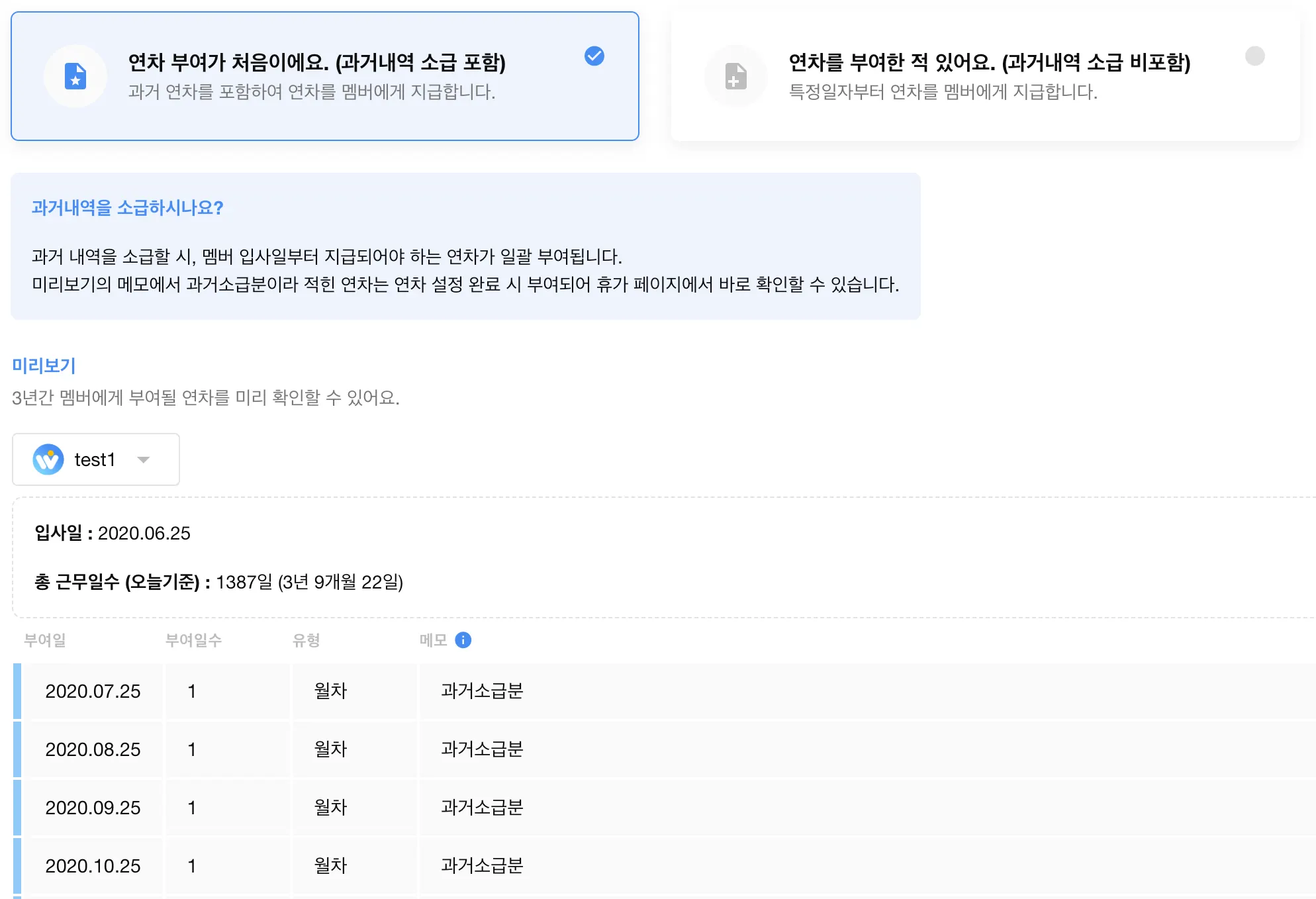 이제 멤버 입사일부터 당일까지 지급된 연차를 모두 자동으로 소급할 수 있습니다.