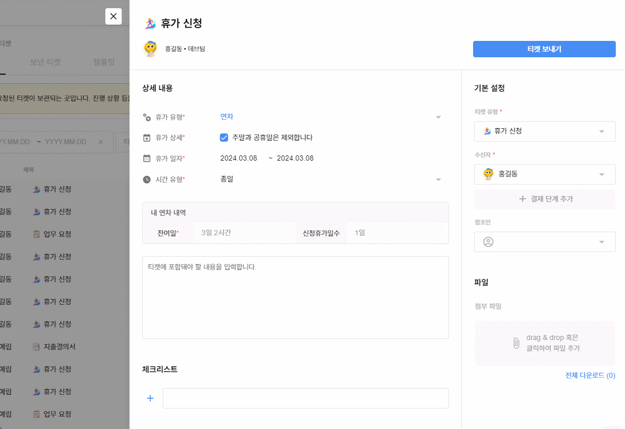 이제 티켓에서 결재라인을 필요한 만큼 지정하고 티켓을 발송할 수 있어요.