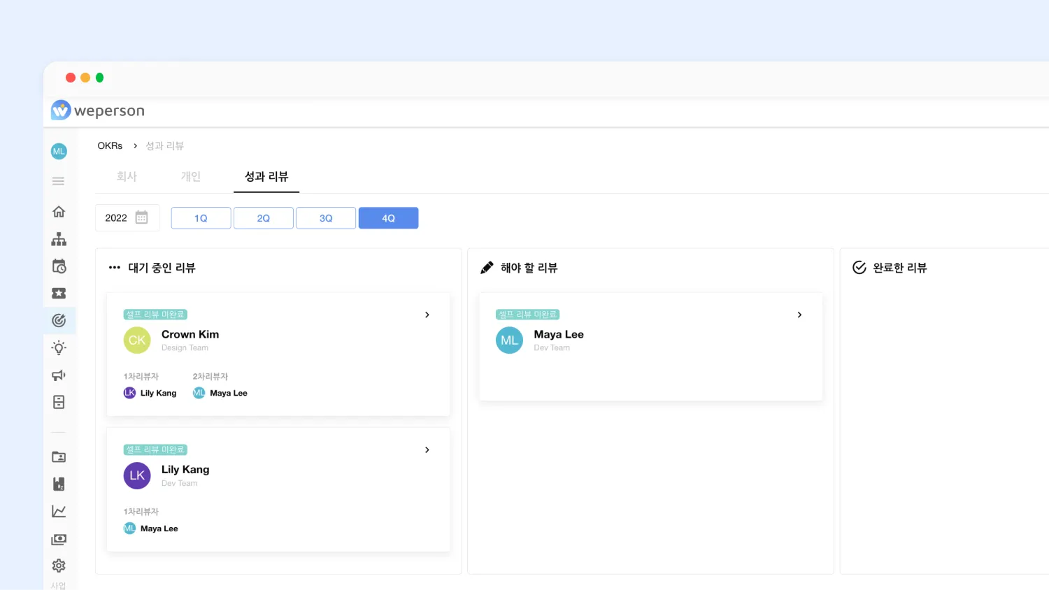 OKRs > 성과 리뷰 > 평가 > 보상으로 연결되는 업무 체계를 간편하게 실행해 보세요.