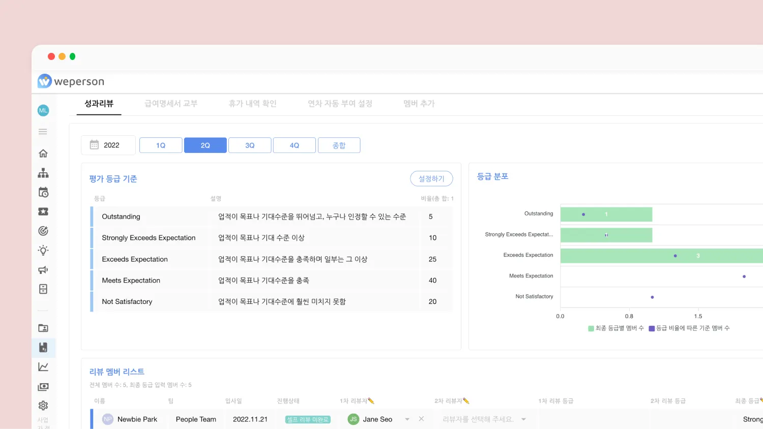 인사행정의 성과 리뷰 메뉴에서 성과 리뷰 진행을 위해 기준을 설정하고,