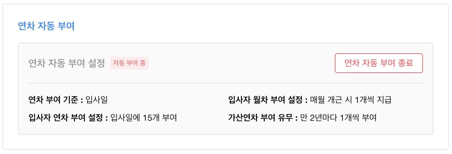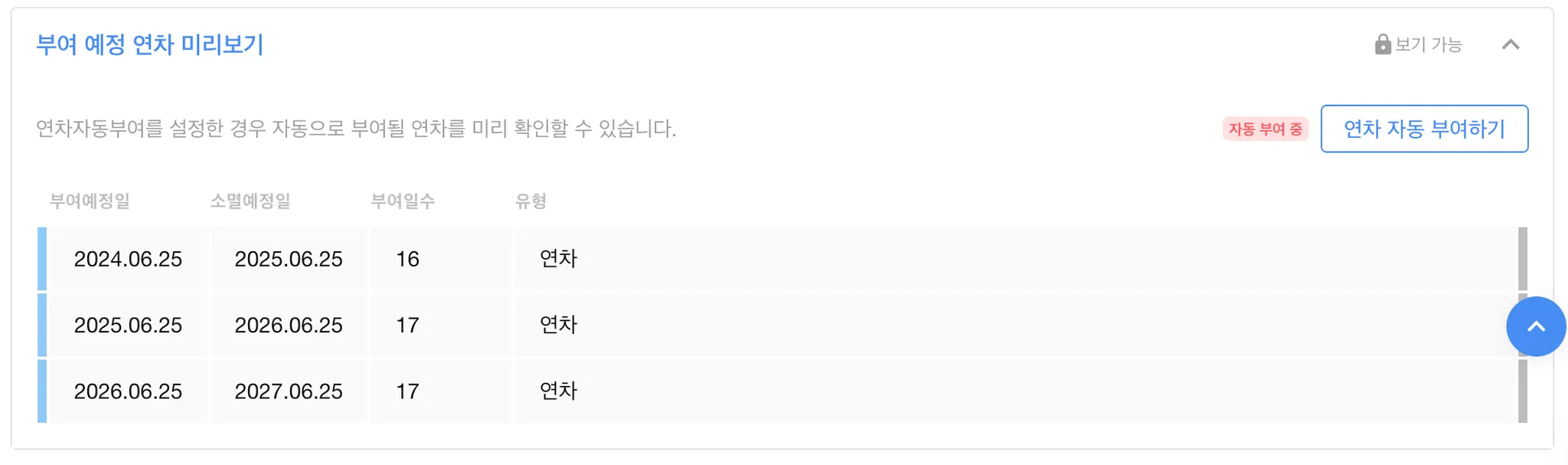 연차 자동 부여를 완료할 경우, 연차 자동 부여 페이지에서 설정된 내역을 요약하여 확인할 수 있어요.