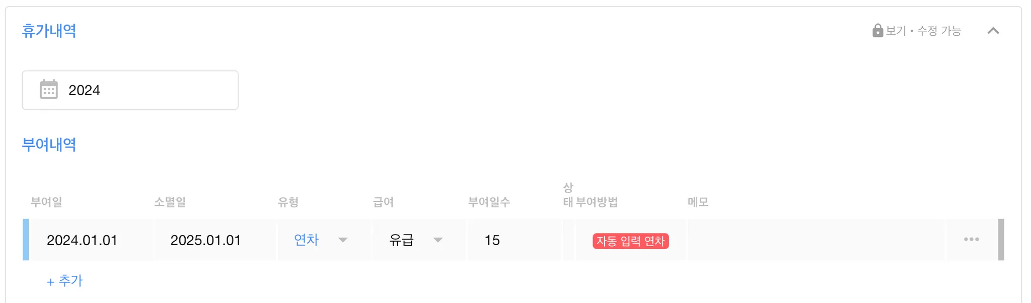 부여내역에서 자동으로 부여된 내역을 확인할 수 있고, 부여될 연차 미리보기에서 앞으로 부여될 연차도 확인할 수 있어요.