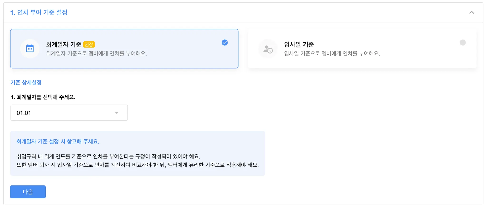 연차를 부여하는 방법에 따라 회계일자 또는 입사일을 선택해 주세요.