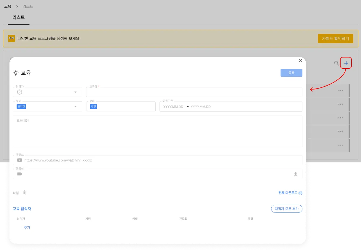 우측 상단의 + 버튼을 클릭하고 교육을 생성할 수 있습니다.
