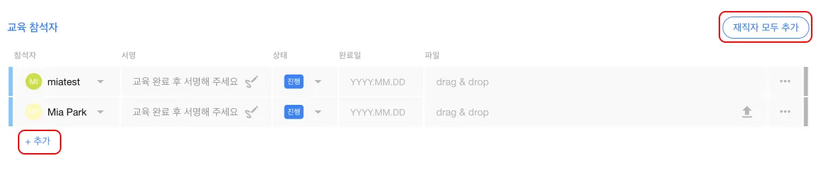 + 추가 버튼을 클릭하면 테이블이 생성되고 교육 참여자를 등록할 수 있습니다.