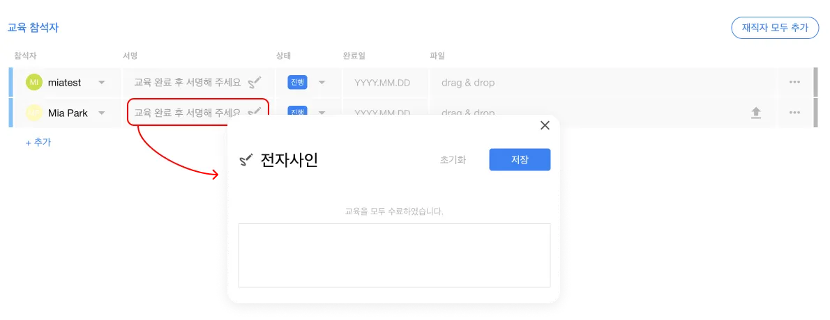 전자서명 버튼을 누르고 서명을 완료하면 자동으로 상태와 완료일이 기록됩니다.