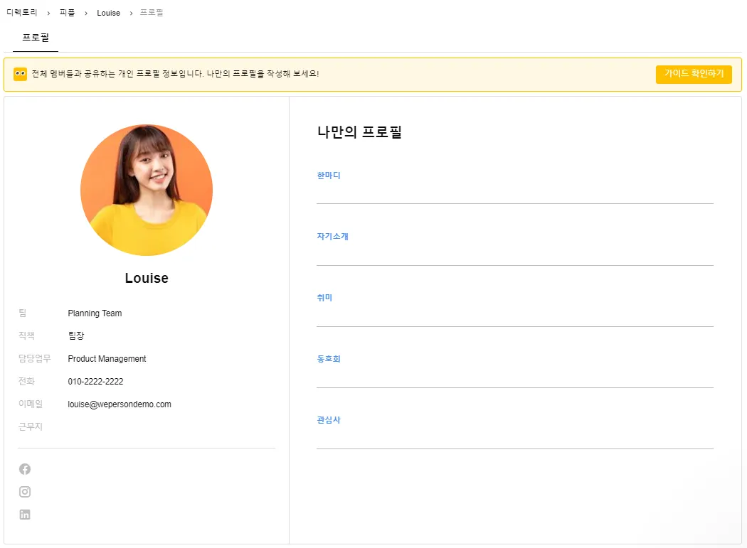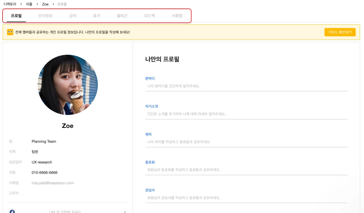 본인의 경우 프로필 외에도 다양한 인사정보들을 확인하고 수정할 수 있습니다.