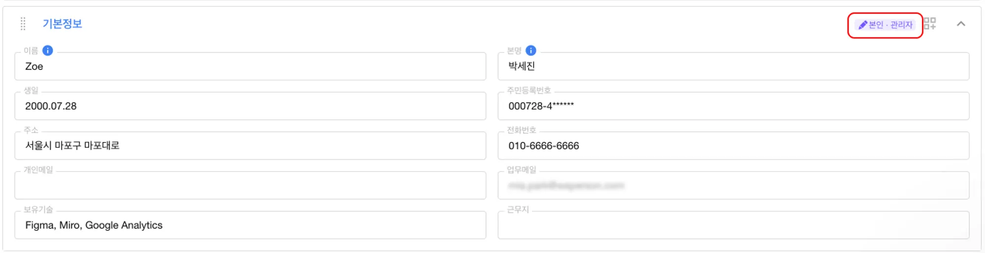 편집 권한 뱃지를 통해 인사정보 중 입력, 수정이 가능한 정보를 확인하고 정보를 편집할 수 있습니다.